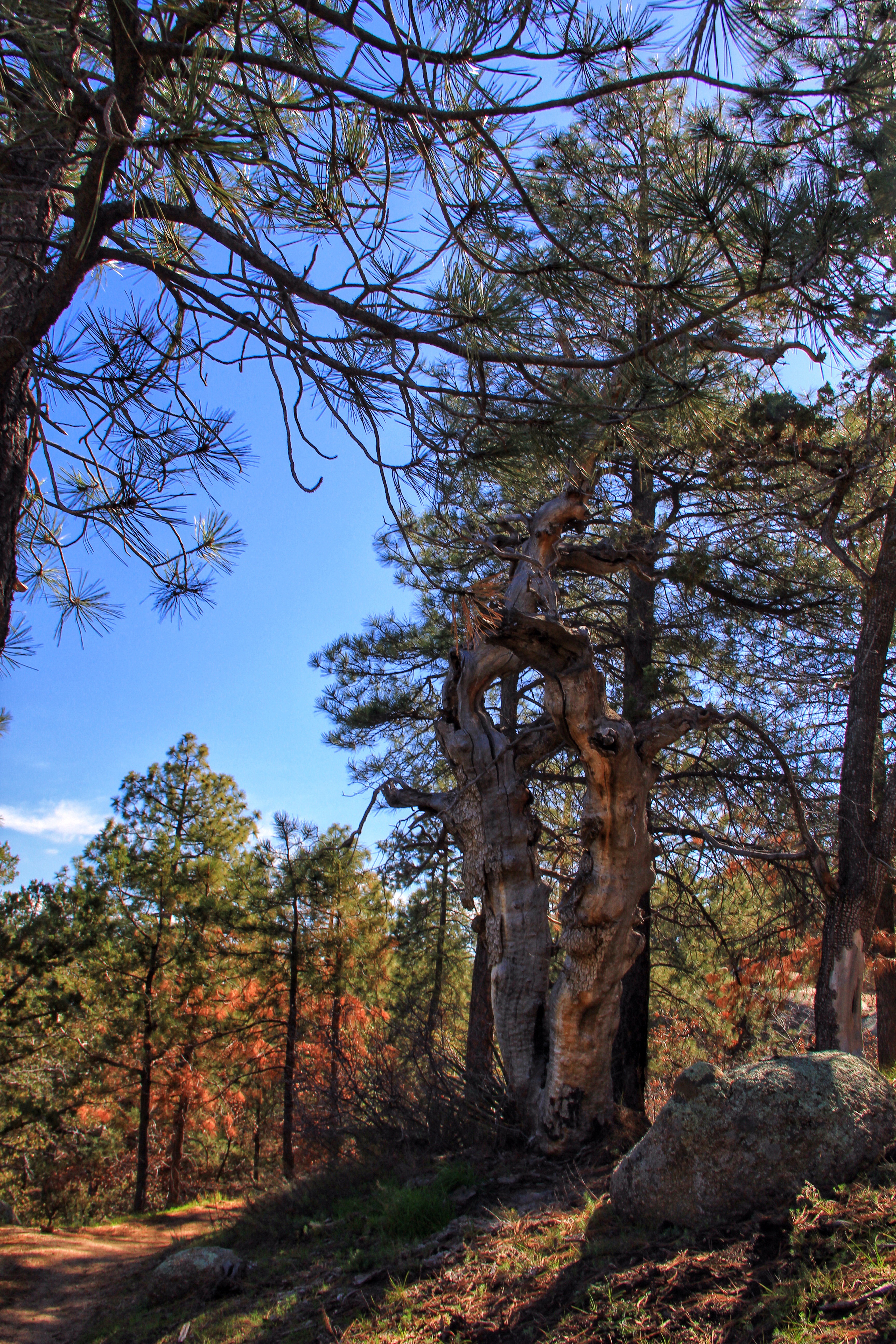 Higher in the trek the views shift eastward over Tonto Basin and Roosevelt Lake. At this elevation we rise mostly above the pine forest.