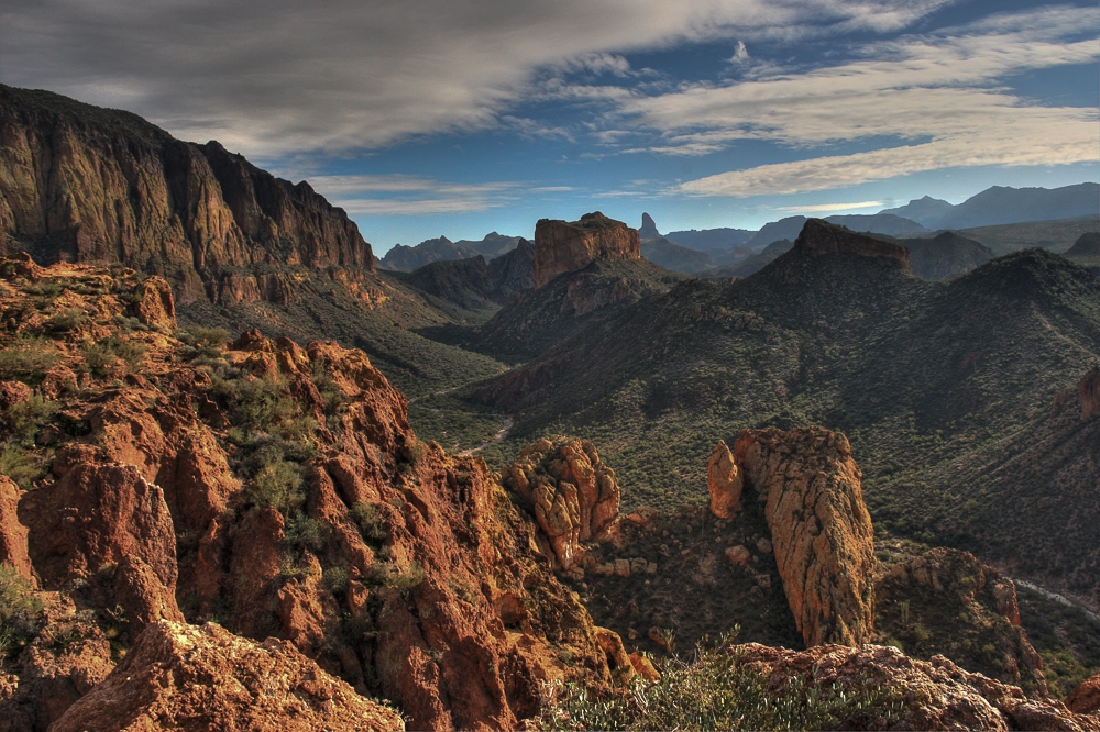 As dawn broke over the landscape, there was an ever-changing drama. Here the peaks of the Superstitions are highlighted as they are raked by the first rays of the rising sun.