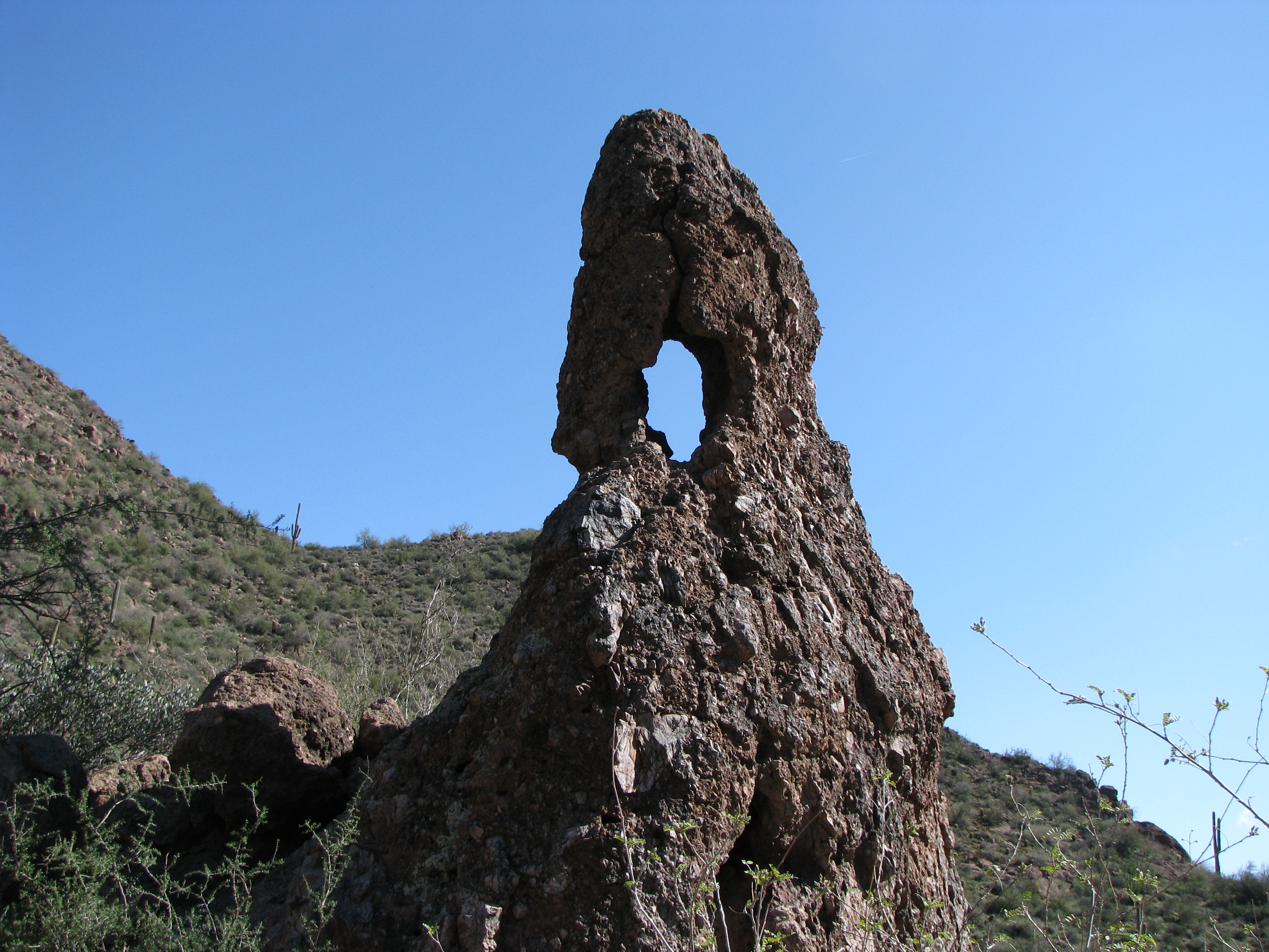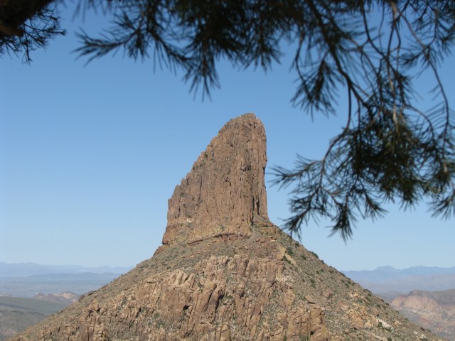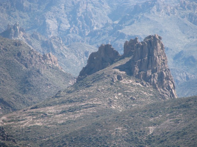 Below is a view into the east from Lonesome Pine overlook. The formation in picture center is Miners Needle, about 4 or 5 miles away. I zoomed for the second photo, so you can see the eye of the needle. Then look back at the first photo to pick out the faint eye.