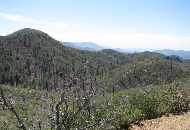 The climb to the trailhead takes your over some 6,000+ foot ridges, and eventually drops down into a small saddle at about 5,600 feet where the trailhead lies.  It was 90+ degrees back at the RV Resort, but a very pleasant 62 degrees at the trailhead.