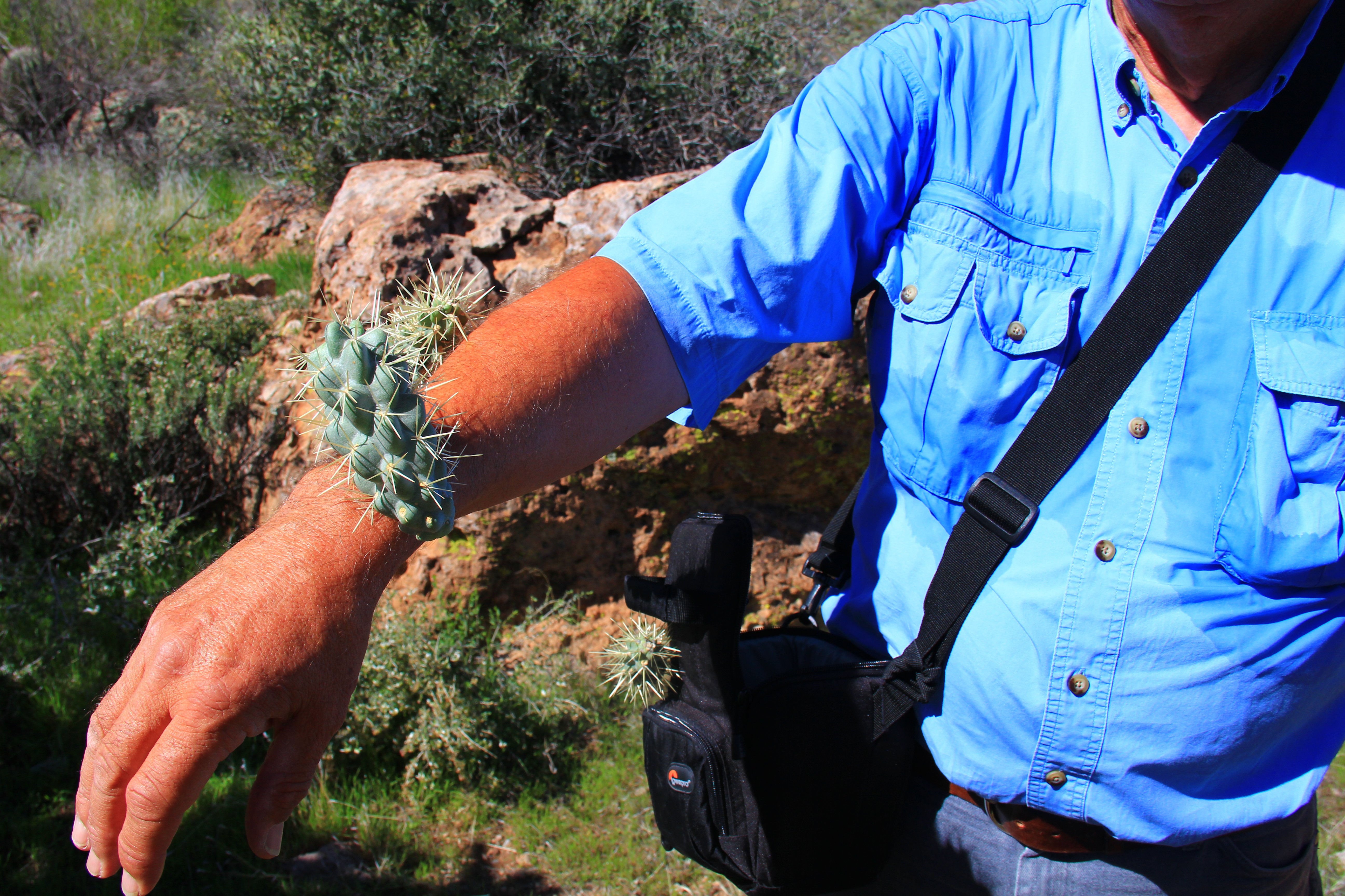 When we stopped for lunch I was searching for a soft boulder to rest my weary bones and had a Close Encounter of the Cholla Kind. Thanks to Jerry and Gary with a comb and pliers, and no lasting damage was done to my arm or camera bag.