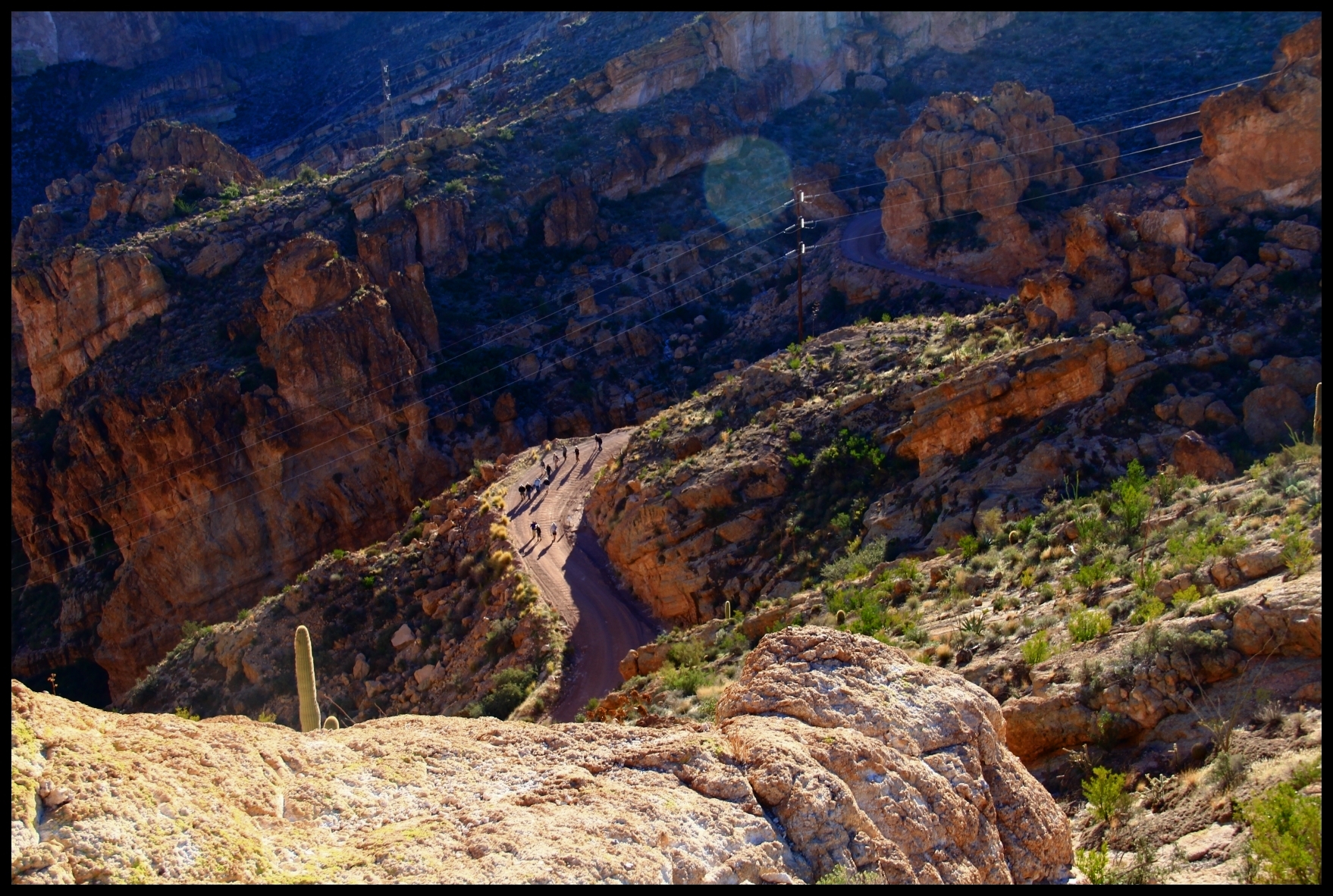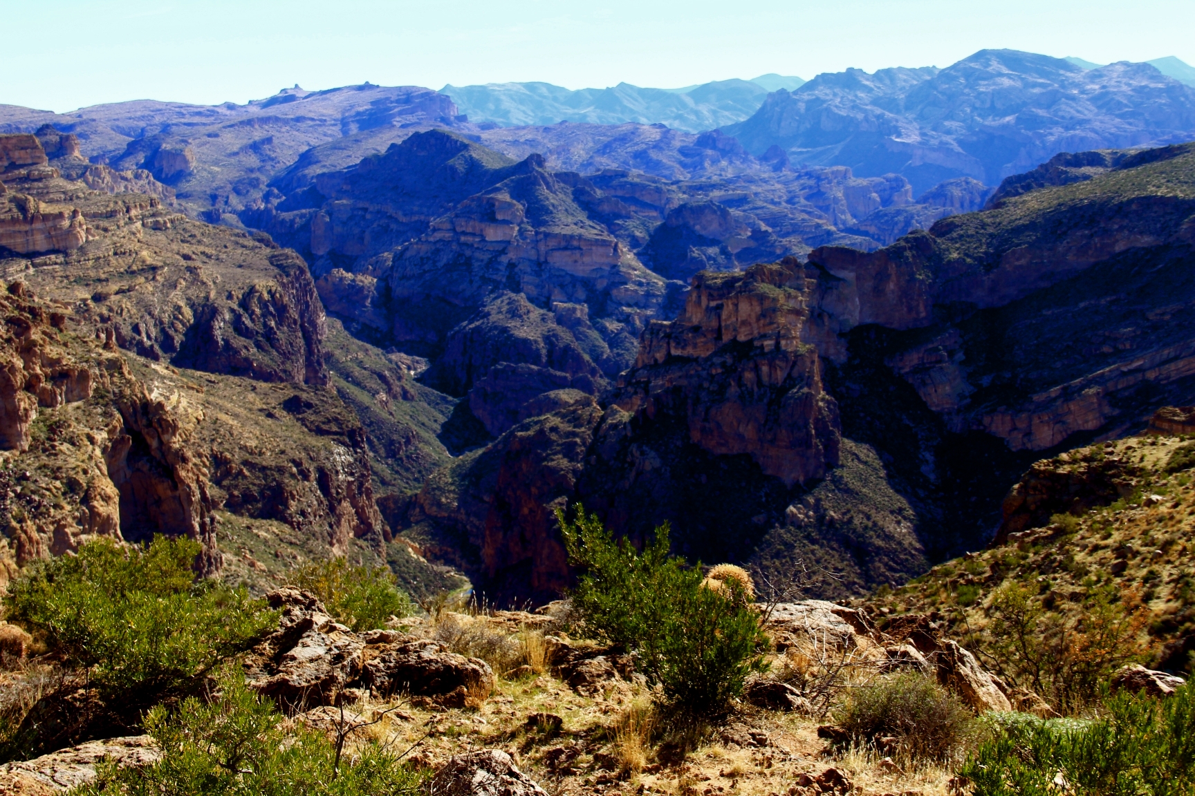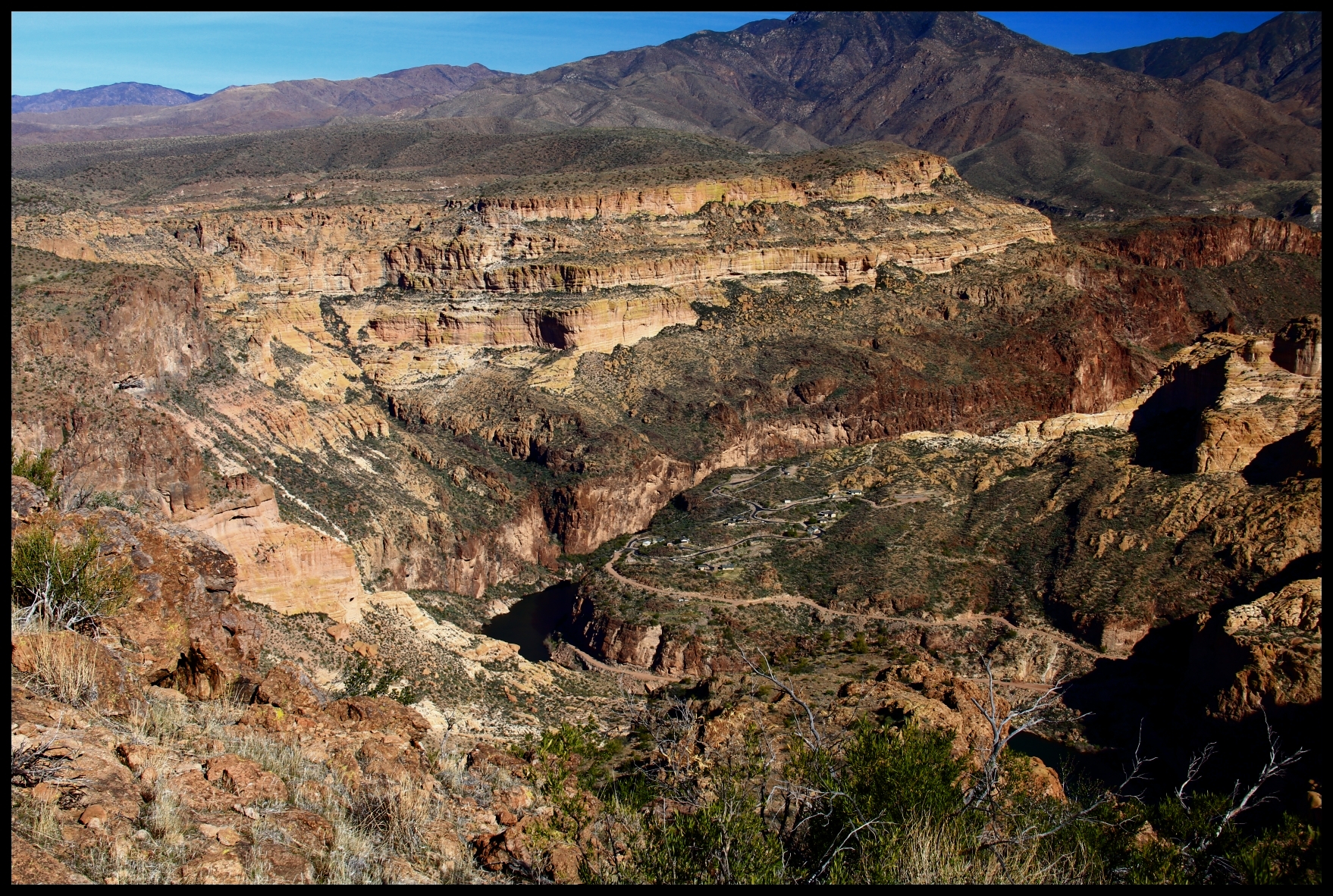 Upstream on the Salt (out of view towards middle right of the photo) is Horse Mesa Dam which forms Apache Lake. Lower center of the photo you can see a cluster of homes for the workers who take care of the dam. It’s a long drive over twisty cliffside roads to the corner store for a loaf of bread!