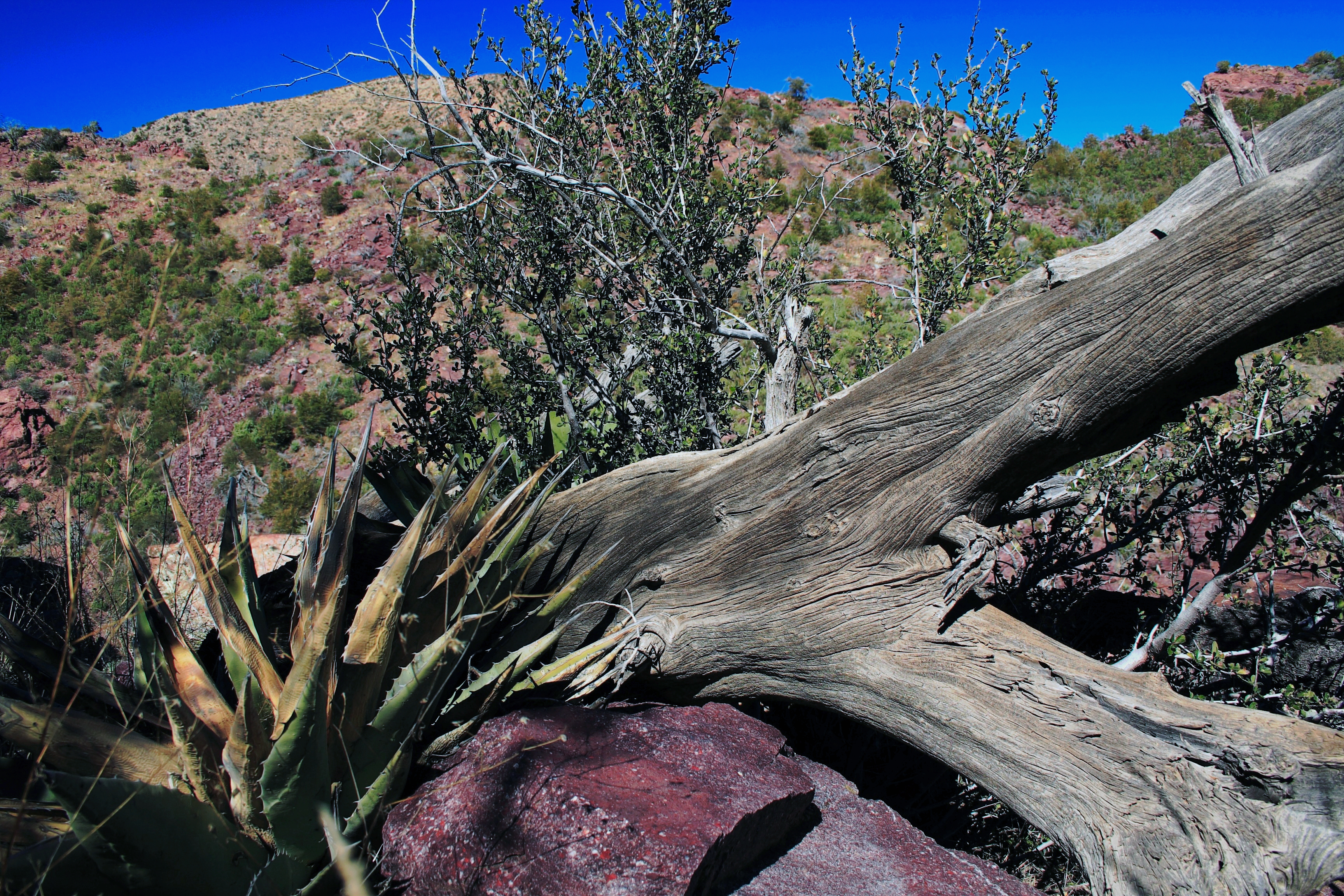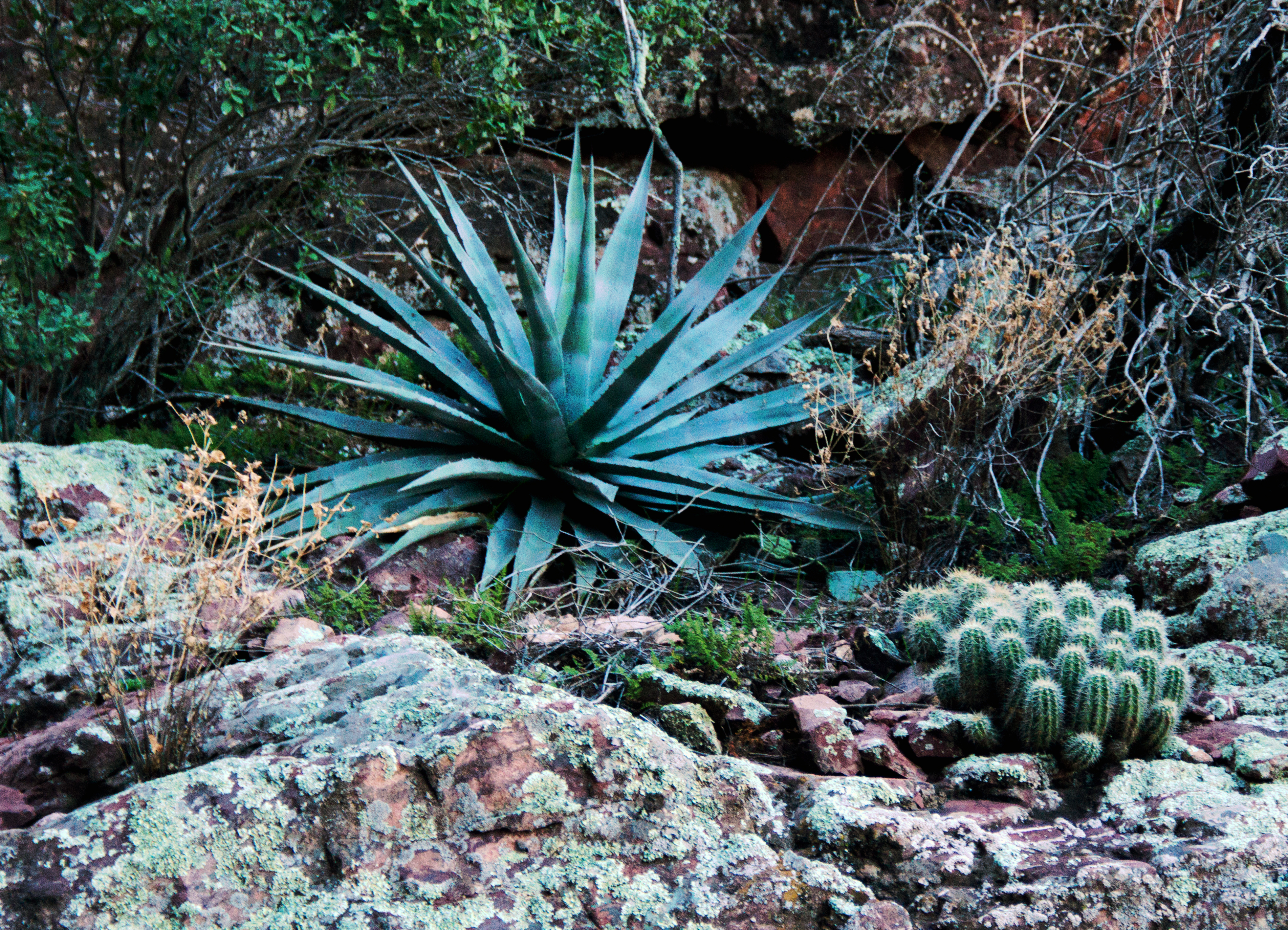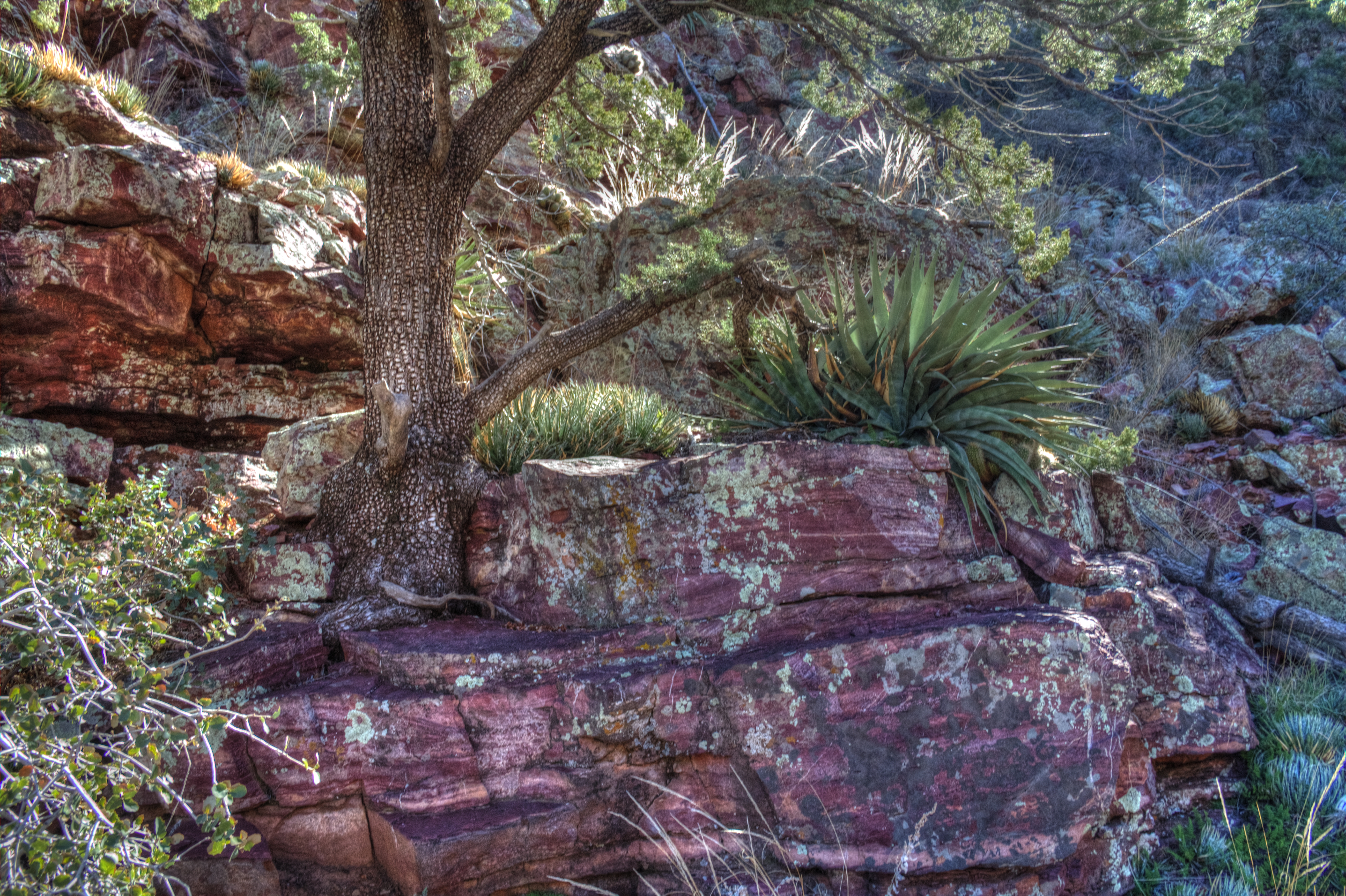 The trek up the canyon can only be described as gorgeous! Due to the elevation, the usual saguaro cactus seen on most of our hikes is replaced with alpine vegetation like holly, juniper, mountain pinion, and some (fallen due to fire) ponderosa. Even so, one “desert” plant, the agave, seems to thrive in this canyon. We saw some really great examples along the way. This example, next to an alligator juniper, gets bigger everytime that I’ve been up here.