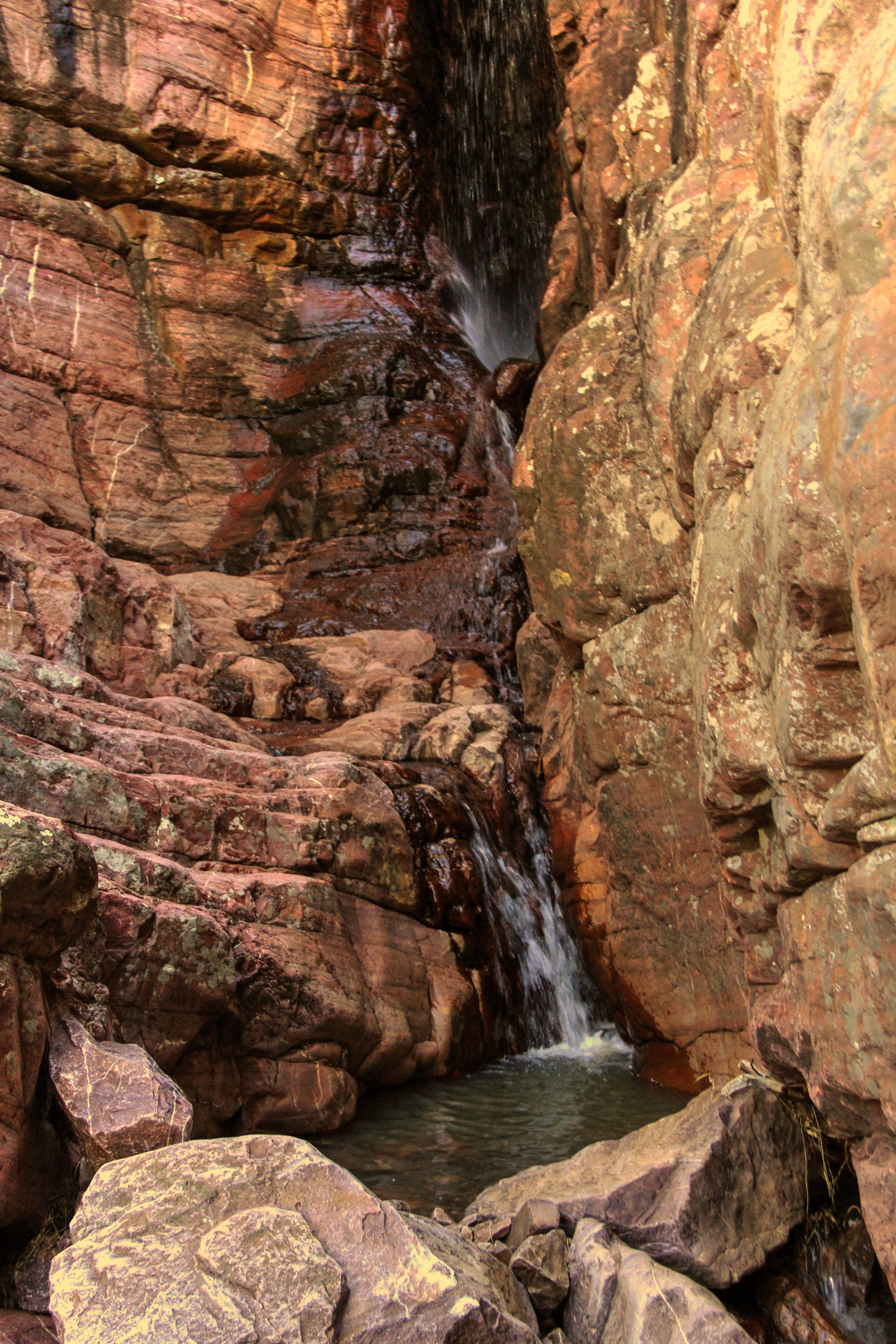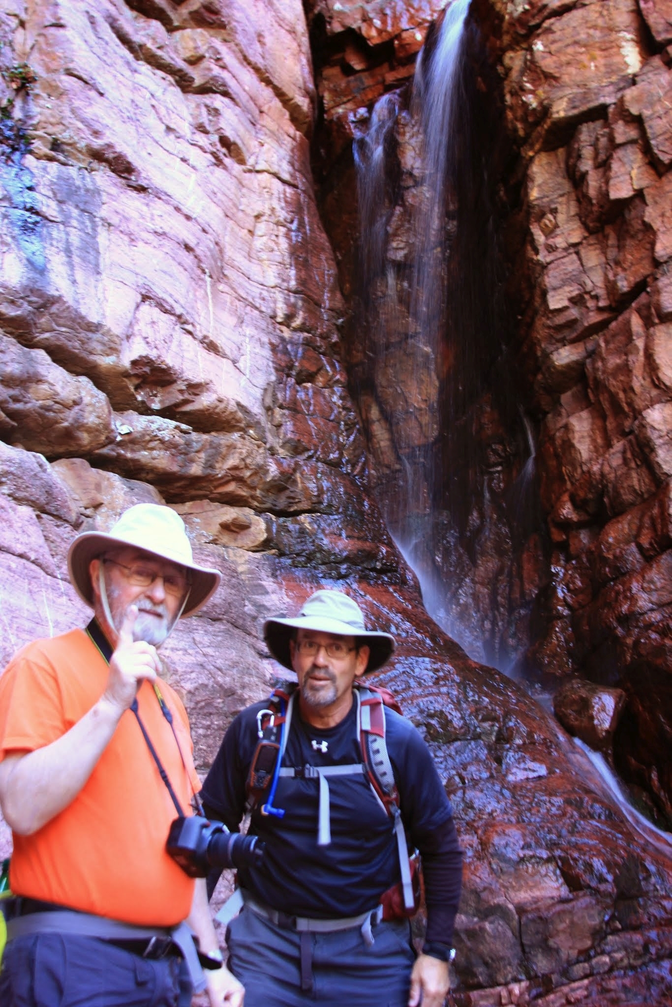 The “destination” and turn-around point for this hike is a series of two waterfalls hidden in a grotto off the established trail. The tip-off is a pool of water along the trail, fed by a little babbling stream. A short trek off the trail, some clambering over rocks, (thanks, Dana, for the steadying hand) and you’re inside a vertical red-rock grotto about 100+ feet tall, with a waterfall merrily splashing from the rocks far above.