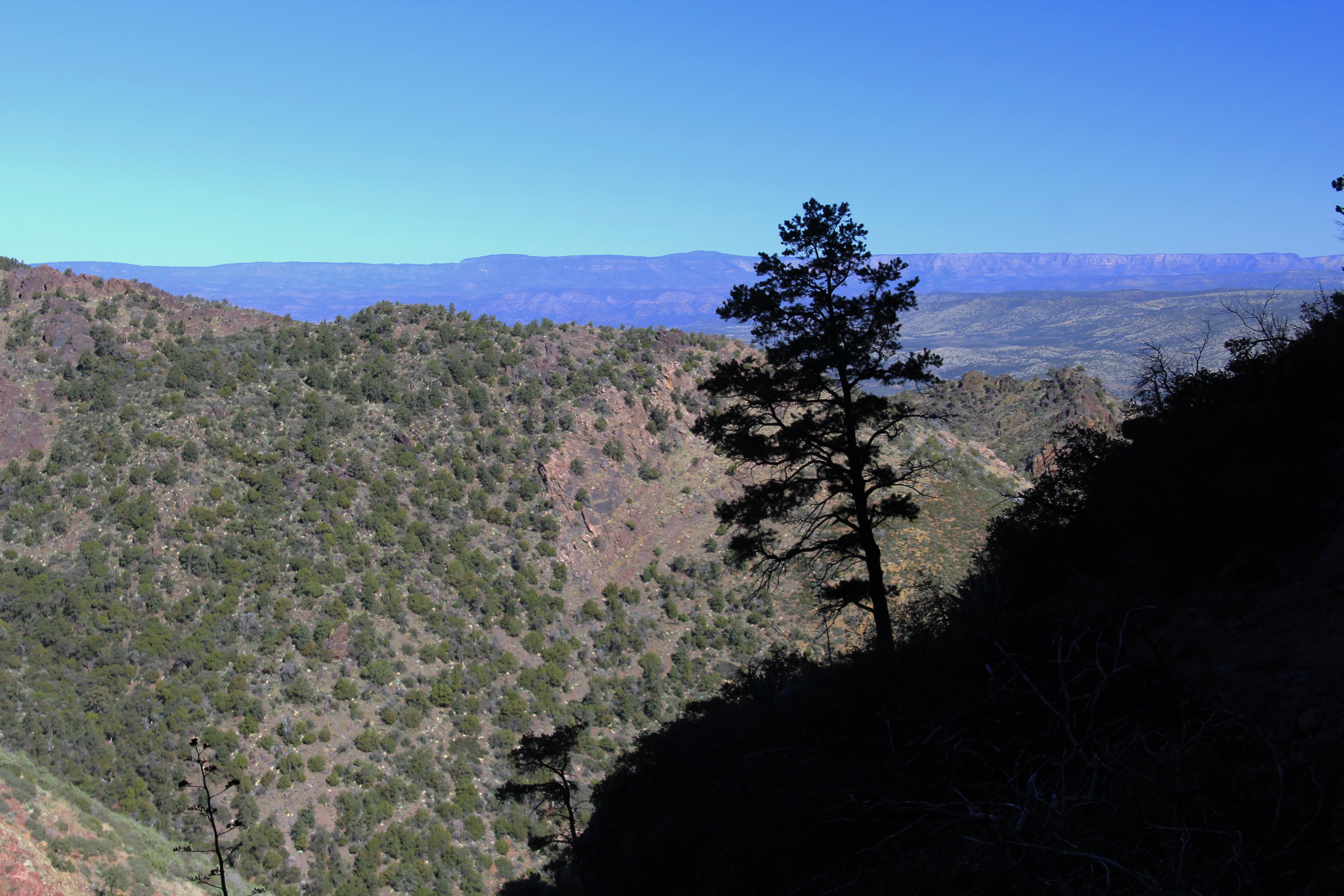 But high on my agenda was a desire to show off the back country and share my love of Arizona hiking with him. One of my favorite hikes is the route to the waterfall grotto at the head of Barnhardt Canyon.