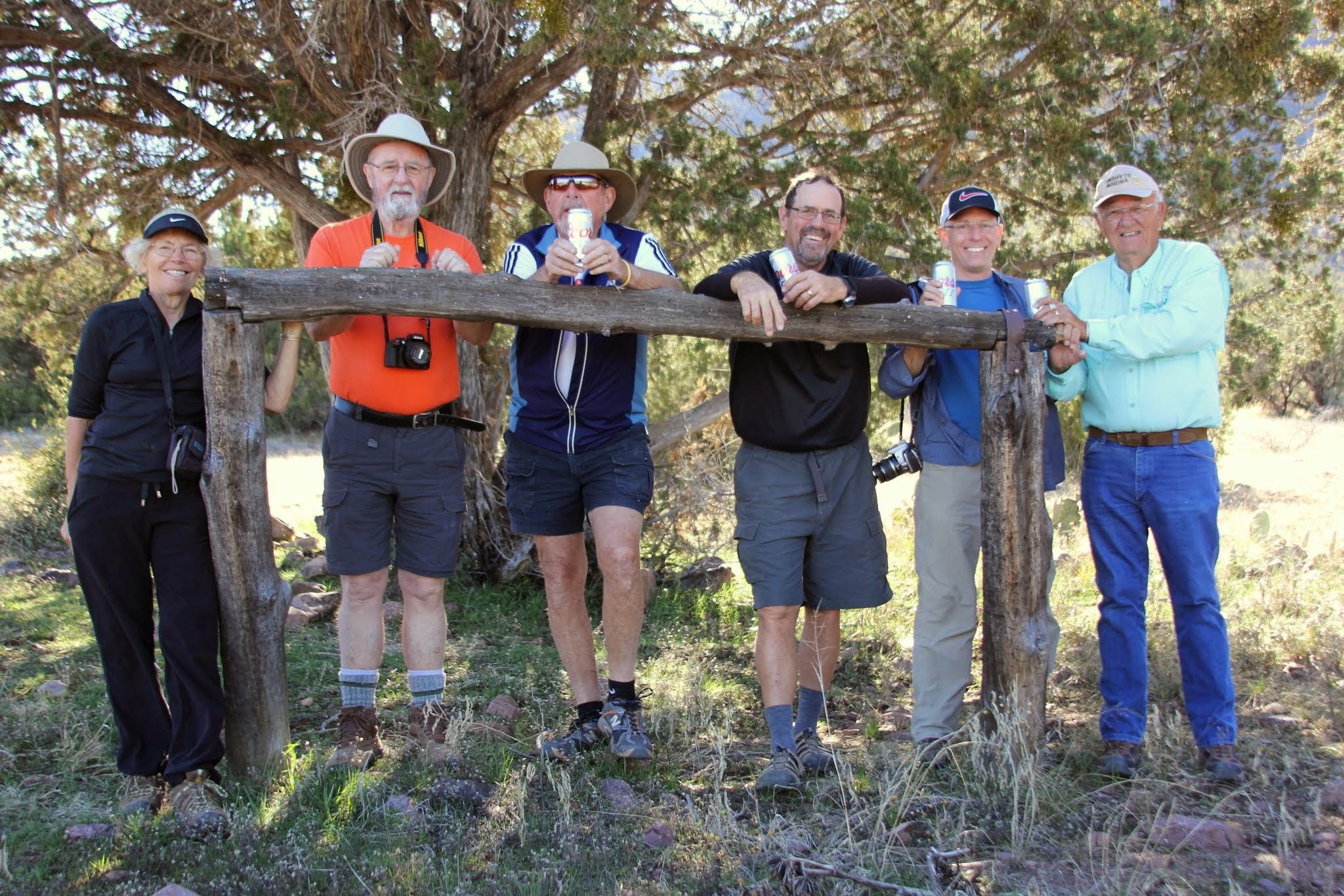 After a long break admiring this find, we hiked back down canyon the same way we came up. Here is a Class Picture of our merry crew (less Debbie, the photographer) assembled back down at the trailhead. Chris says this hike was the highlight of his trip to Arizona. Thanks to all who made him feel so welcome, and for not telling too many “Hans stories” in his presence!